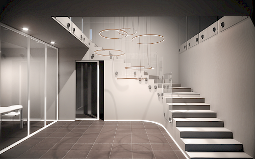 In diesem Open-Space-Büro setzt die Pendelleuchte LEGGERA mit einer eleganten Komposition aus leuchtenden Ringen einen besonderen Akzent im Treppenbereich. SPOT Ø 15 cm Einbauleuchten ergänzen das Konzept mit präzisem, gleichmäßigem Licht und betonen Flächen sowie Wege. Ein Lichtprojekt, das Wirkung und Funktion vereint – für einen einladenden, professionellen Raum.