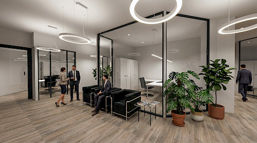 Ein moderner, heller Empfangsbereich: Die runden Pendelleuchten Bellai Home setzen leichte, architektonische Akzente, während die lineare M24 das Konzept mit einer präzisen, funktionalen Lichtlinie ergänzt. Eine elegante Lösung, die Raum und Begegnung aufwertet.