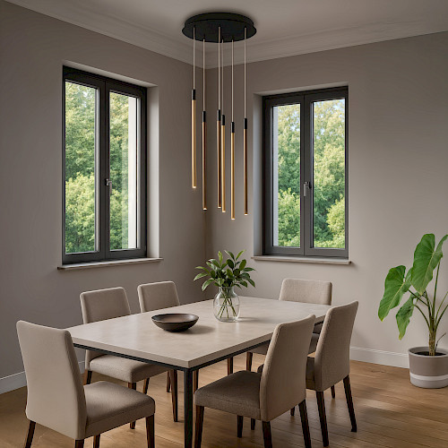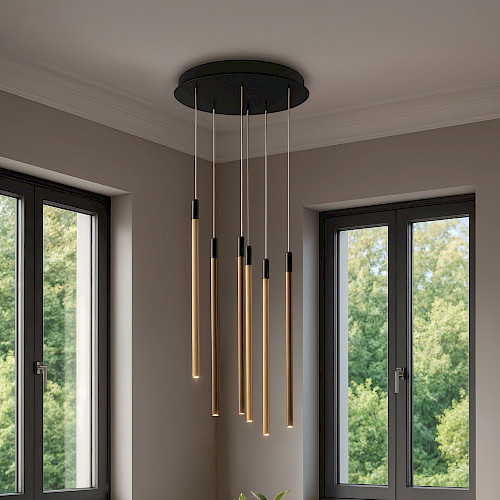Coordinated and modular elements in different lengths, liquid painted aluminum body with precious two-tone finishes.