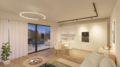In this open-plan kitchen–living space, the LEGGERA pendant creates a light, elegant halo above the lounge area, delivering a soft, enveloping glow. In the corner, a track with adjustable spotlights adds precise, flexible lighting—perfect for highlighting the kitchen and key focal points. A balanced mix of ambience and function, in harmony with light finishes and warm wood tones.