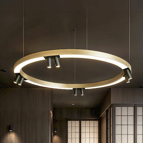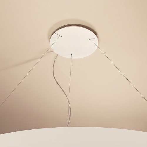 Sospensione circolare a LED con struttura in alluminio verniciato e diffusore in policarbonato opale o prismatizzato.