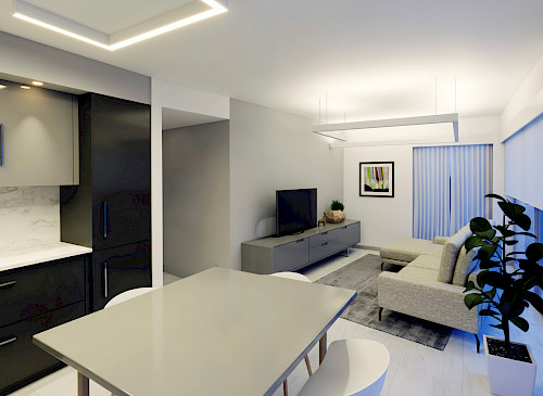 Nell’open space cucina–living, MIRÒ interpreta l’illuminazione come elemento architettonico: la sospensione sopra l’area relax crea una luce morbida e diffusa, mentre il plafone MIRÒ completa la scena con un’emissione uniforme che rende l’ambiente luminoso e ordinato. Un progetto essenziale e contemporaneo, perfettamente integrato con le finiture neutre e le linee pulite dell’arredo.